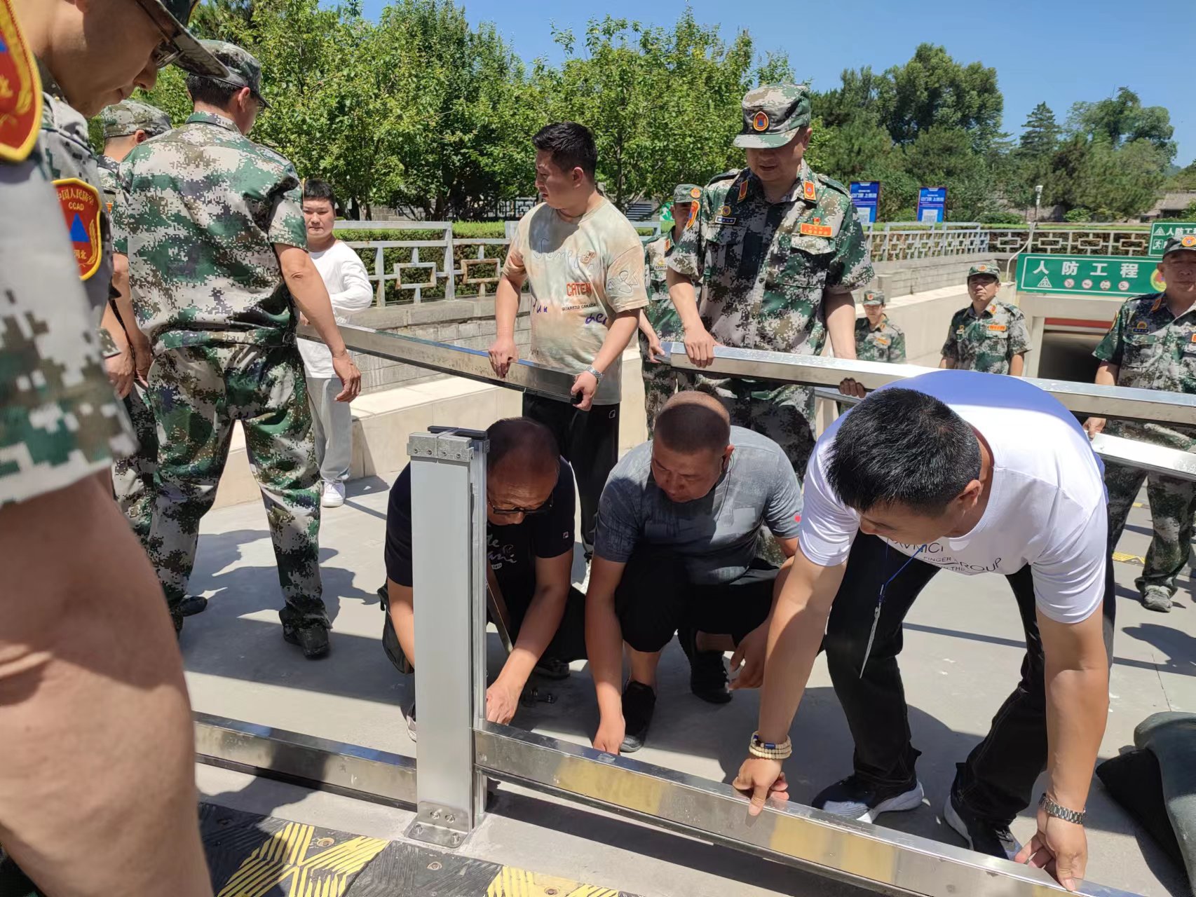 隨著現(xiàn)場指揮一聲令下,演練正式開始。停車場及人防辦工作人員把演練當(dāng)做實戰(zhàn),按照演練前講解的防汛知識和注意事項,協(xié)調(diào)配合、分工明確,緊張有序地安裝擋水板,堆堵防汛沙袋。