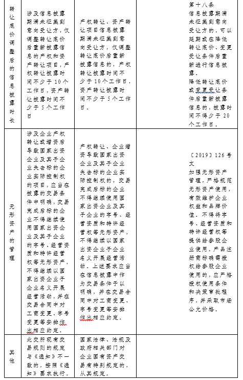 八、產(chǎn)權(quán)轉(zhuǎn)讓、資產(chǎn)轉(zhuǎn)讓項(xiàng)目信息披露期滿未征集到意向受讓方,僅調(diào)整轉(zhuǎn)讓底價(jià)后重新披露信息的,產(chǎn)權(quán)轉(zhuǎn)讓披露時(shí)間不少于10個(gè)工作日,資產(chǎn)轉(zhuǎn)讓披露時(shí)間不少于5個(gè)工作日。(與32號(hào)文相應(yīng)規(guī)定相比,縮短了信息披露的時(shí)間,提升了效率)