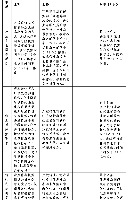 六、企業(yè)增資可采取信息預(yù)披露和正式披露相結(jié)合的方式,通過產(chǎn)權(quán)交易機(jī)構(gòu)網(wǎng)站分階段對(duì)外披露增資信息,合計(jì)披露時(shí)間不少于40個(gè)工作日,其中正式披露時(shí)間不少于20個(gè)工作日。信息預(yù)披露應(yīng)當(dāng)包括但不限于企業(yè)基本情況、產(chǎn)權(quán)結(jié)構(gòu)、近3年審計(jì)報(bào)告中的主要財(cái)務(wù)指標(biāo)、擬募集資金金額等內(nèi)容。七、產(chǎn)權(quán)轉(zhuǎn)讓可在產(chǎn)權(quán)直接持有單位、企業(yè)增資可在標(biāo)的企業(yè)履行內(nèi)部決策程序后進(jìn)行信息披露,涉及需要履行最終批準(zhǔn)程序的,應(yīng)當(dāng)進(jìn)行相應(yīng)提示。(與32號(hào)文相應(yīng)規(guī)定相比,將增資行為作為法定信息披露的內(nèi)容)